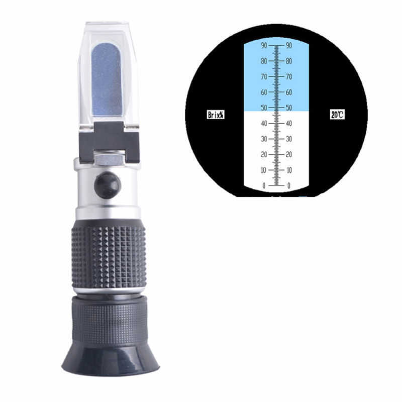 Im Inneren des Messgerätes sehen Sie eine Zahlskala von 0-10 (oder 0-20 oder 0-30) mit ein blauer Abschnitt auf der Oberseite und ein weißer Abschnitt auf der Unterseite. Die Grenze zwischen diesen beiden Abschnitten bestimmt die Brix-Ebene. In einer idealen Situation wird der untere (weiße) Abschnitt bis zu 1,5 auf der Skala erreichen, wobei alles über 1,5 blau ist. Im obigen Bild liegt der Brix-Messwert bei etwa 48.